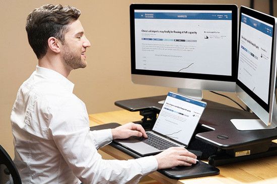 How long should you really stand at your desk? According to research and physician recommendation, many office workers find a 1:1 ratio of sitting to standing optimal for productivity and comfort, alternating every 30 minutes. However, if you’re not used to standing, you may want to expand the 30 minutes of sitting into 45 minutes or even an hour. If you’re just starting, ease into standing with a 2:1 ratio (alternating 60 minutes of sitting with 30 minutes of standing throughout the day), and see if your strength builds to the point where you’re comfortable sitting for less and less time—until you reach that 1:1 ratio.